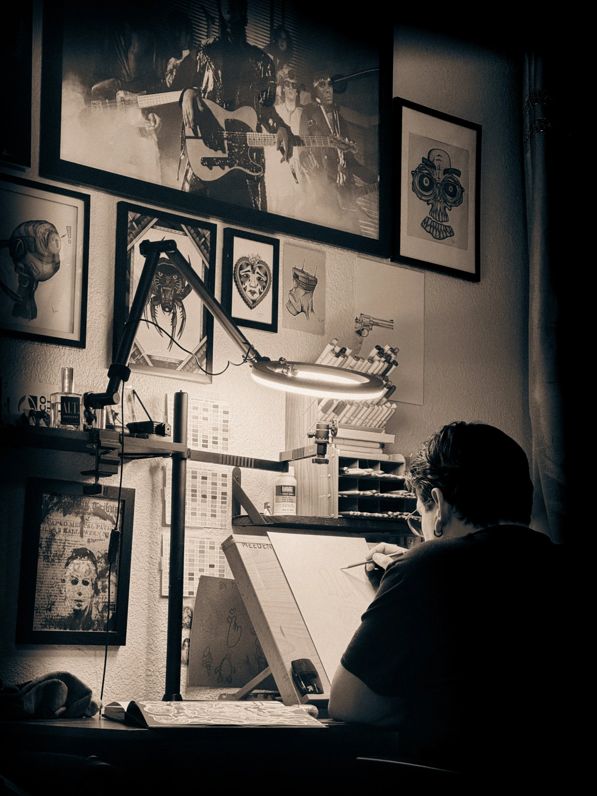I don’t call myself an ‘artist’ and I never will. I just draw stuff. I paint sometimes, too. My work is all over the place, literally. It’s on walls, in the trash, all over the floor ripped to shreds, or on a hard drive somewhere.